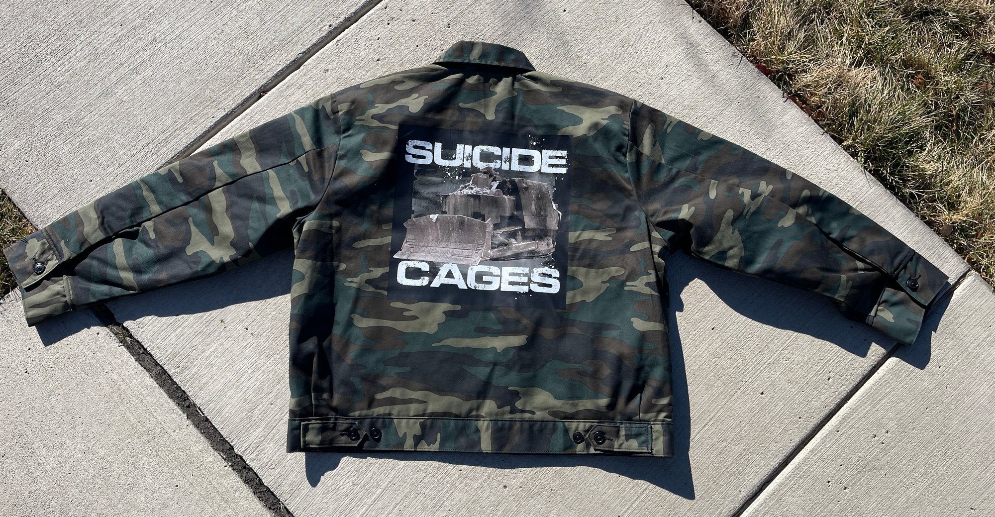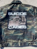 This is a limited item (only 17 made). Dickies Eisenhower insulated work jacket. Suicide Cages Killdozer logo on back, Braeburn Records embroidered patch on front chest. Camo design.